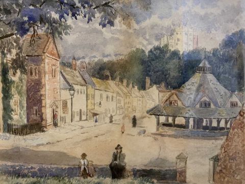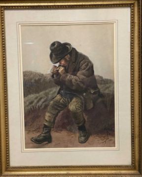 H J RILEY ('71) watercolour - seated man in lane lighting his clay pipe, signed and dated lower right, 39 x 29cms and another watercolour, early 20th century - figures seated in town square with castle beyond, unsigned, 21.5 x 28cms