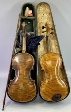 A VIOLIN - two piece back, 37cms, bearing label 'Copy of Caspar Da Salo, Hood Kirkcaldy', 60cms L overall, another violin with a two piece back, 37cms L, 60cms overall, with a wooden case and a bow and a Jolli Joe ukulele by The UK Uke Co, blue painted metal case, 55cms L with a case(GOV.UK self-declaration form completed for the sale of this item - Submission reference XVAZ9HAE)