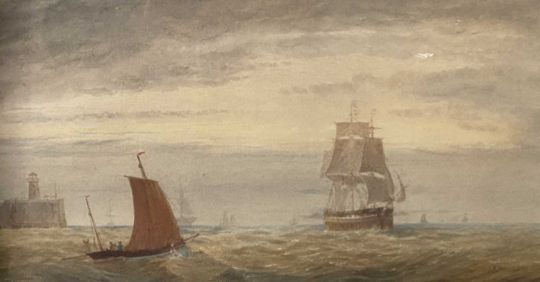 19TH CENTURY watercolour - sailing vessels with lighthouse to side, indistinctly signed lower right, 19 x 36cms and a second late 19th century watercolour - sheep grazing with extensive landscape, indistinctly signed lower left, 13.5 x 11cms
