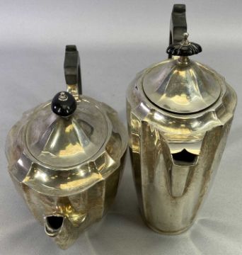 HALLMARKED SILVER TEAPOT & LIDDED HOT WATER POT - Birmingham 1947, Maker Barker Brothers Silver Ltd, both having segmented form bodies with ebony handles and lid finials, 15.5cms H, 28.5cms overall L and 21.5cms H, 22.5cms overall L, measurements respectively, 41.3ozt gross