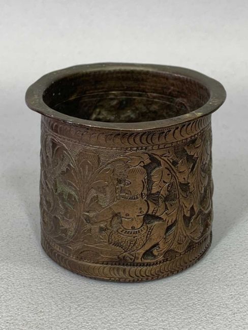 BUDDHIST COPPER CIRCULAR DRINKING VESSELS, A PAIR - Tibet or Nepal, 19th century, with chased and repousse foliate and figural decoration, 6cms H, 7.5cms diameter and a volume on Buddhism and Hinduism in Nepal