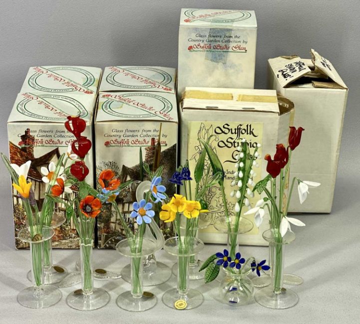 SUFFOLK STUDIO GLASS - collection of 12 handmade glass, flower arrangements in clear glass vases, daisies, poppies, roses, buttercups, crocus, Lily of the Valley, snowdrops, ETC, 18cms H the tallest, seven with boxes