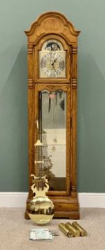 MODERN OAK LONGCASE CLOCK - with movement by Kieninger and labelled Howard Miller, with rolling moon effect and brass dial, pendulum, triple weights and manual included, 212cms H, 58cms W, 34cms D