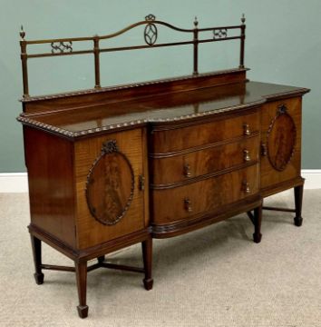 CIRCA 1900 MAHOGANY BREAKFRONT SERVER/SIDEBOARD - a fine elegant example with brass rail and curtain back, on tapered and spade feet, 148cms H, 183cms W, 67cms D