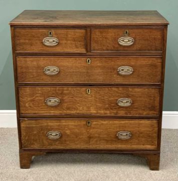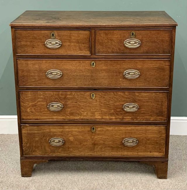ANTIQUE OAK CHEST - two short over three long drawers having brass oval backplates and swing handles, on bracket supports, 108cms H, 102cms W, 50cms D