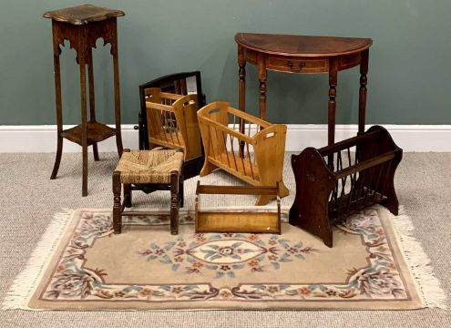 FURNITURE ASSORTMENT (7) - to include two magazine racks, planter stand, half moon table, string topped stool, rug and a book rack