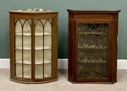 ANTIQUE CORNER CUPBOARDS (2) - wall hanging, the first with lattice effect single glazed door, 107cms H, 76cms W, 42cms D, the other with bow front twin glazed doors, 104cms H, 73cms W, 45cms D