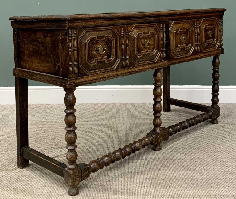 JACOBEAN STYLE OAK DRESSER BASE - having twin panelled drawers, on bobbin supports and stretcher, 90cms H, 154cms W, 52cms D
