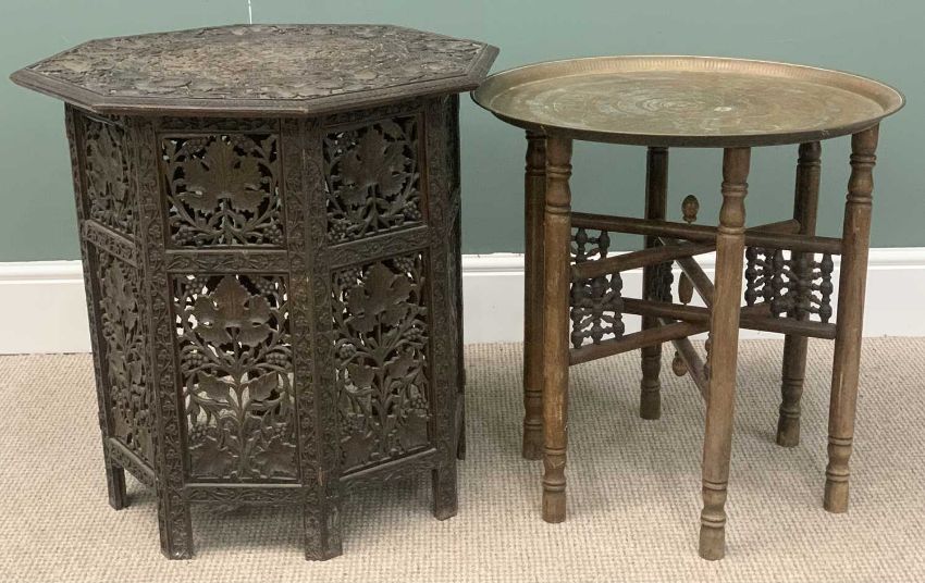 EASTERN OCCASIONAL TABLES x 2 - a carved folding hexagonal top example and a Benares brass type, 64cms H, 67cms diameter and 57cms H, 58cms diameter respectively