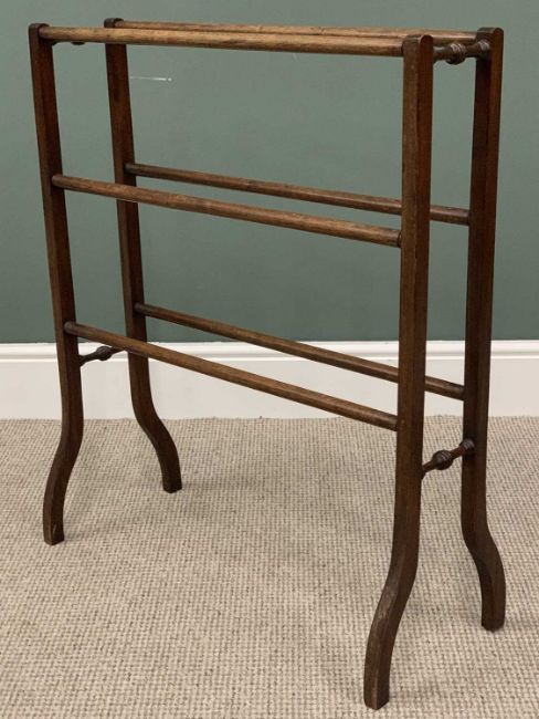 CIRCA 1900 CROSSBANDED MAHOGANY NIGHT CABINET, 78cms H, 40cms W, 36cms D and TWO VINTAGE TOWEL RAILS, 93cms H and 84cms H