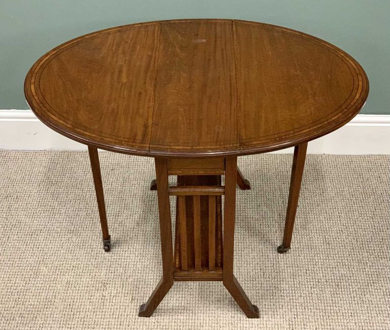 EDWARDIAN CROSSBANDED MAHOGANY SUTHERLAND TABLE - twin flap with tapering supports on brown pot castors, 63cms H, 61cms D, 23cms L (closed), 86cms L (open)