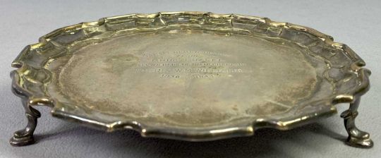 PRESENTATION SILVER CALLING CARD TRAY - London 1942, Maker Israel Freeman & Son Ltd, 17.75cms diameter, having a shaped border on three hoof feet, inscribed to the centre 'A small remembrance from Rhug Chapel, Well Wishers to their Chaplain, The Reverend W M Williams, 1938 - 1944', 8.5ozt