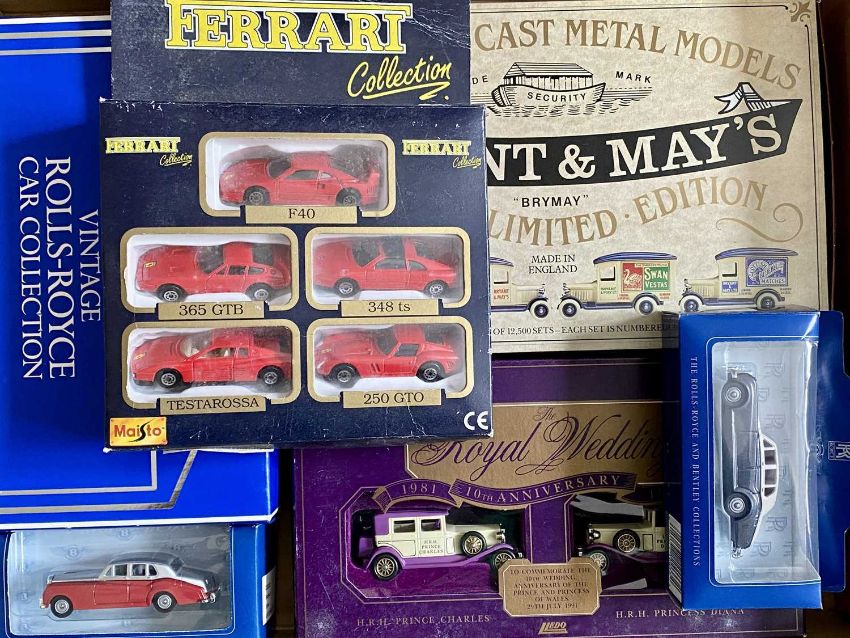 MATCHBOX, LLEDO, DAYS GONE & OTHER COLLECTORS PACK DIECAST VEHICLES to include a boxed Models of Yesteryear Connoisseurs Collection Limited Edition No S0135 in a mahogany effect display case, Bryant & May's Limited Edition boxed set, Royal Wedding 10th Anniversary set, Days Gone Rolls Royce Collection set, special 24ct gold plated from a Limited Edition of 7500, Lledo Vintage Rolls Royce Car Collection 125/7500, two single boxed Days Gone Rolls Royce vehicles and a Maisto Ferrari Collection set of five diecast and plastic cars and OXFORD DIECAST VEHICLES 1:76 SCALE & N GAUGE - a quantity, approximately 50