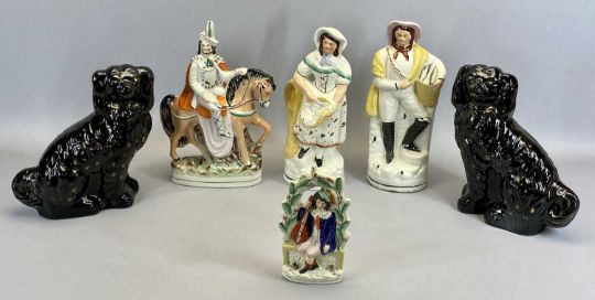 STAFFORDSHIRE FLATBACK FIGURES (4) - late 19th century, pair well coloured fisherman and wife, 35cms H, figure on horse, 35cms H, figure seated under a floral arch, 21cms H and a pair of Jackfield ware type seated spaniels with moulded fur and gilded highlights, 27.5cms H