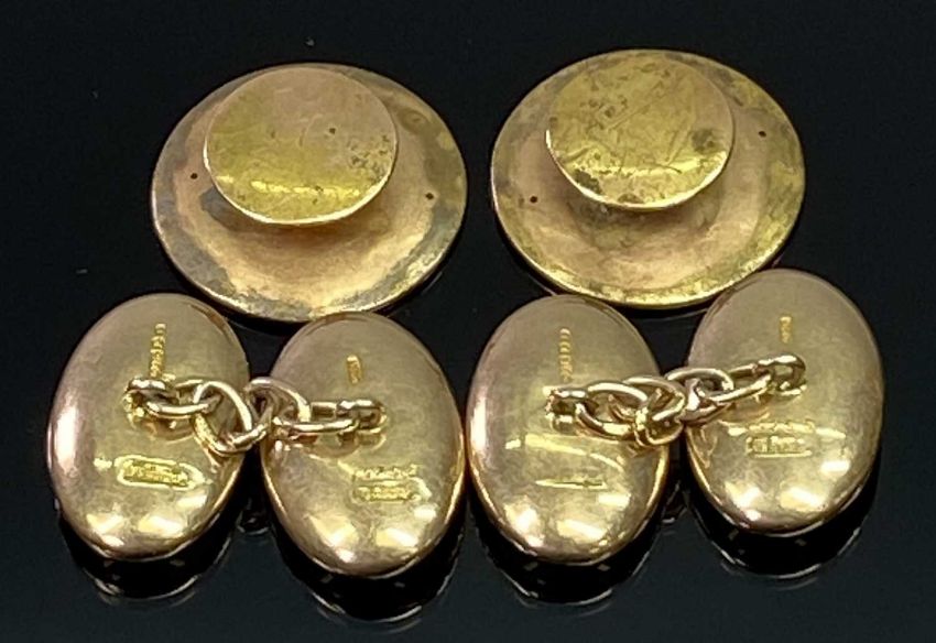 9CT GOLD GENTLEMAN'S CUFFLINKS, A PAIR - in closed back oval format, 5.3grms, along with a pair of unmarked yellow metal stud buttons with floral decoration to the front