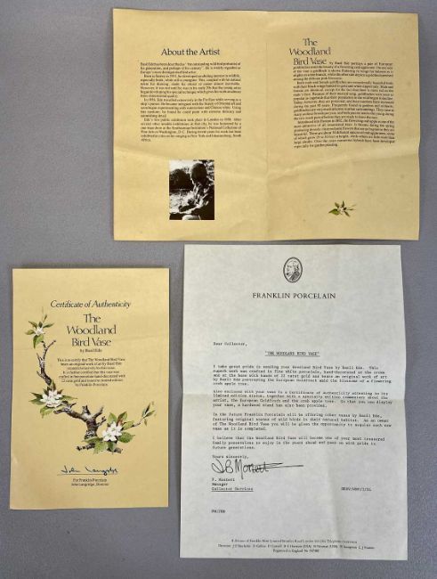 FRANKLIN PORCELAIN - 'The Woodland Bird Vase' by Basil Ede, of baluster form and decorated with European goldfinch and flowering crab apple, on hardwood stand, 32cms H, boxed with paperwork, a pair of German ceramic bud vases, 10cms H and a contemporary green glaze bottle vase, 31cms H