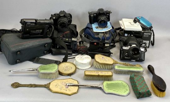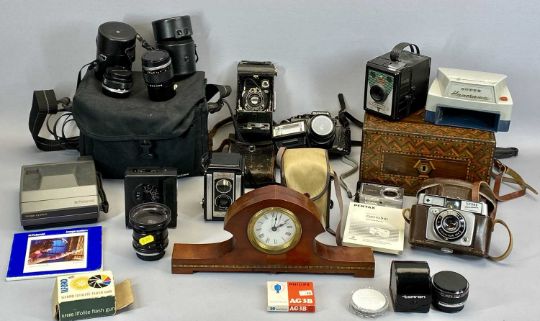 CAMERAS & EQUIPMENT - Olympus OM40 with two Olympus lenses and flash, Cannon EOS digital SLR camera, a Leica compact camera, Kodak boxed brownie, ETC