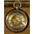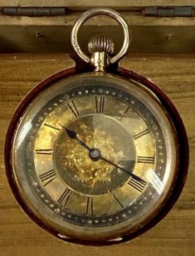 LADY'S VINTAGE 14CT GOLD CASED FOB WATCH - in a boxwood watch holder, the gilt metal dial foliate engraved, set with Roman numerals, case outer rim and back with foliate chased decoration and vacant shield shape cartouche, stamped '14k' to the case back interior, 33mm case diameter, appears working when listed, 32.8grms gross