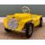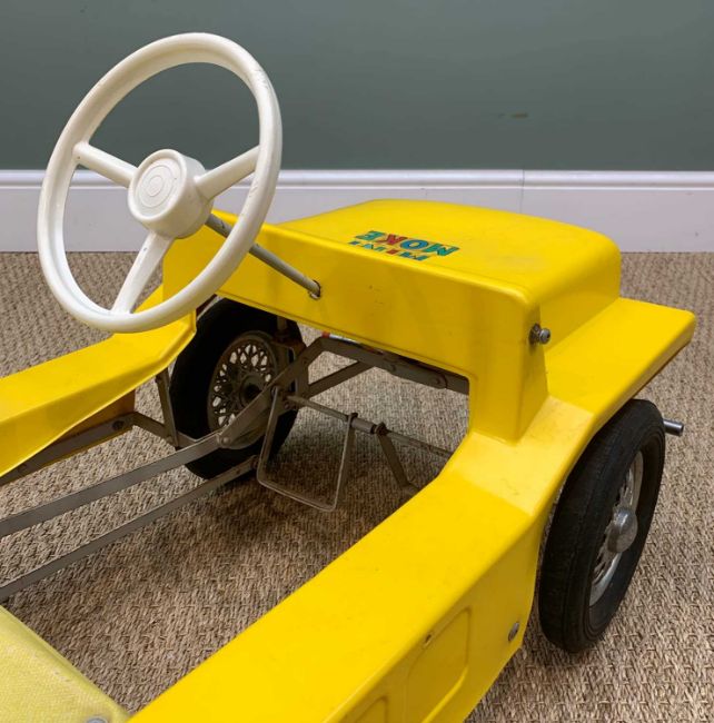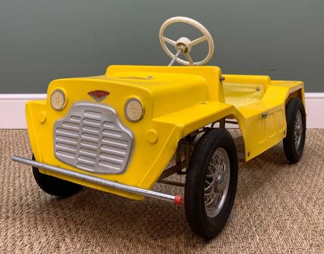 1960s LEEWAY MINI MOKE PEDAL CAR, yellow plastic with coloured decals.Comments: some moderate corrosian to metal chassis and fenders, on fendor red plastic cap missing, some deacals split.