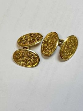 PAIR OF 18CT GOLD OVAL CUFFLINKS, scroll and foliate engraved, 11.4gms, in J. W. Long & Co Cardiff boxProvenance: private collection Ceredigion, consigned via our Cardiff Office
