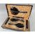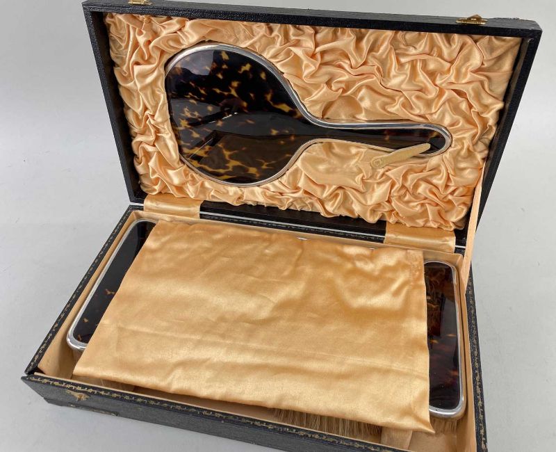 GEORGE V CASED SILVER & TORTOISESHELL DRESSING TABLE SET, W. G. Sothers Ltd., Birmingham 1921/24, comprising mirror, comb, two pairs brushes, in peach silk-lined black papered case with gilt tooled borderComments: very little if any use, very good condition, comb slightly warped.