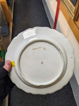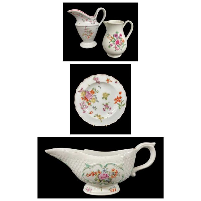 DERBY PORCELAIN OVAL SAUCE BOAT, c. 1765, moulded with an overlapping leaf and reserved with panels of summer flowers within green scrolled borders, further floral springs to interior and spreading foot, brown enamel rim, 21cm longProvenance: private collection Neath Port Talbot, consigned via our Carmarthen OfficeComments: firing fault to handle, green enamel faded, otherwise very good. TWO 18TH CENTURY ENGLISH PORCELAIN CREAM JUGS, including Worcester sparrow beak jug with grooved strap handle, decorated with an insect, sprigs and a spray of summer flowers, gilt rim, c. 1760, 8.8cm high; and a New Hall N191 pattern silver shaped jug, decorated with undulating floral garland to the neck above flowers sprays and spreading foot, c. 1795, label for A. de Saye Hutton New Hall Collection, 11.6cm h (2)Comments: Worcester with hairline crack at spout.Provenance: private collection Neath Port Talbot, consigned via our Carmarthen Office CHELSEA RED ANCHOR PORCELAIN PLATE, c. 1756-58, with lobed rim, decorated with sprays and sprigs of summer flowers, brown rim, base with red anchor mark, 21.4cm diam.Provenance: private collection Neath Port Talbot, consigned via our Carmarthen OfficeComments: 2 chips to footring, surface scratches and rim rubbed, under rim with firing fault.