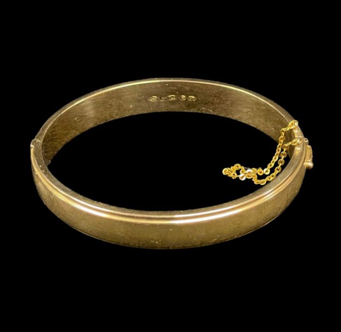 14K GOLD PLAIN HINGED BANGLE, engraved 'Sylvia 20.4.1965', stamped '585' and with mark for Turku, Finland, 15.4gms
