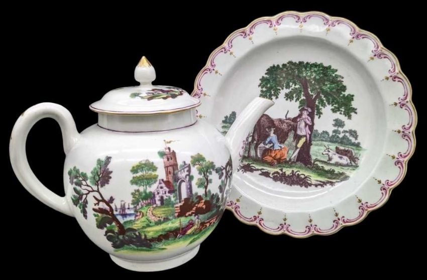 18TH CENTURY WORCESTER comprising teapot and cover printed in puce with 'Ruin by the Cliff', the reverse with 'Two Bridges', also finely coloured by hand, Zorensky Collection label to base, circa 1764, 14cms high, together with Worcester plate printed in black with 'Milking Scene no. 1', depicting a gentleman leaning against a tree talking to a milkmaid milking a cow, finely coloured by hand within a puce scrolled border, circa 1768, 18cms diameter (2)
