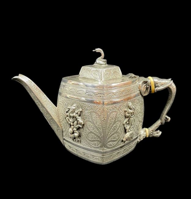 INDIAN-STYLE ELECTROPLATE TEAPOT, c. 1849, William Hutton & Sons, of lozenge section, each face applied in relief with a Hindu deity, hinged stepped cover with coiled cobra knop, elephant and crabstock handle with ivory insulators, 25cm longivory ref P49NY4DN.