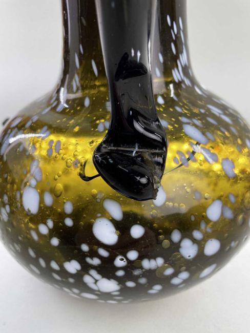 LARGE NAILSEA GLASS JUG, c. 1800, globular form with slightly waisted neck and pinched spout, applied scroll handle with kick base, of olive-green tint with splashed opaque-white inclusions, 23.5cms high