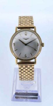 9CT GOLD LONGINES GENTS BRACELET WATCH, c. 1960, brushed silvered dial with Arabic quarters, centre seconds, manual wind, Swiss Morgenstem gold and 9/375 marks to case, on aftermarket non-Longines 9ct gold bracelet, dial and case signed, 33mm diam., gross wt appr. 61gComments: ticks when wound, lettering on the back partially worn. Caseback unopened.