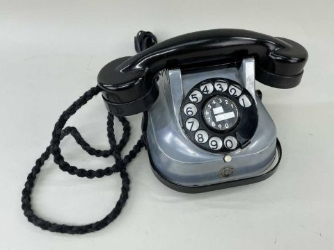 VINTAGE BELGIAN FTR BAKELITE & METAL TELEPHONE, c. 1950s, with hinged carry handle (fitted with modern wire and BT style 6-pin plug)