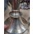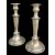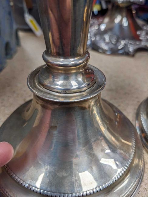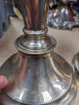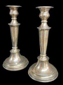 PAIR OF GEORGE VI HALLMARKED SILVER CANDLESTICKS, by E Viners, Sheffield, with beaded decoration complete with matching original hallmarked sconces/drip pans, weighted bases, 23cms highComments: splits to bases of columns, generally worn, one not straight, hallmarks a little rubbed, one baize base loose with dent to foot and cracked/loose pitch inside.