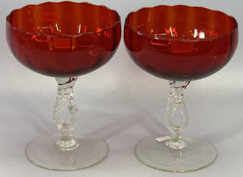 JOSEF HOSPODKE FOR CHRIBSKA SKLO UNION, a retro mid-century Studio glass vase of pulled form, having white rim and fading pink and green colourway, 36cms H, another similar, 25cms H, another similar 16cms H, a similar footed bowl, 8cms H x 24.5cms W x 14.5cms D, a similar vase fading red and blue colourway, 44cms H, a pair of retro red glass sweetmeat bowls on clear twist pedestals and circular feet, 19cms H, 14cms diameter and three Vi troland type retro transparent moulded glass block bricks, 19.5cms sq x 10cms D