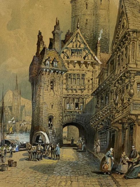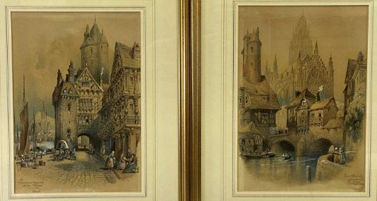 ROBERT RANDOLL French view watercolour studies (2) - one titled 'A picturesque quayside Arles Rhone', 35 x 24cms, the other titled 'The Cathedral Auxerre - Central France', 36 x 24.5cms, both signed