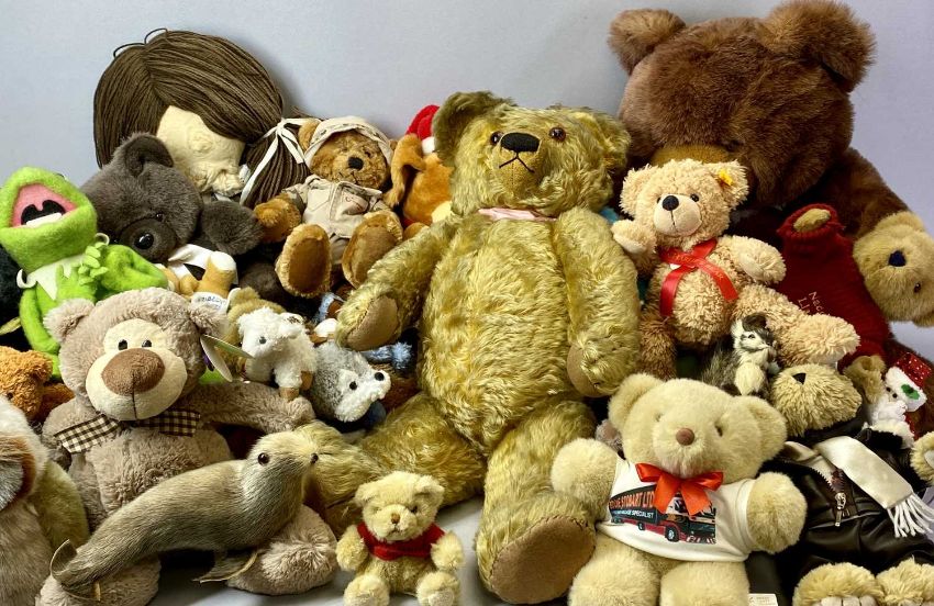 VINTAGE PLUSH TEDDY BEAR with felt hands, 56cms tall and a large collection of other Teddy bears and soft toys