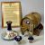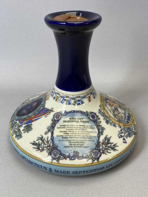 PUSSER'S BRITISH NAVY RUM, a coopered one gallon cask on stand with Certificate No 044, a Wade decanter, 1 litre with contents intact, and an oil lamp with glass shade, 20cms H