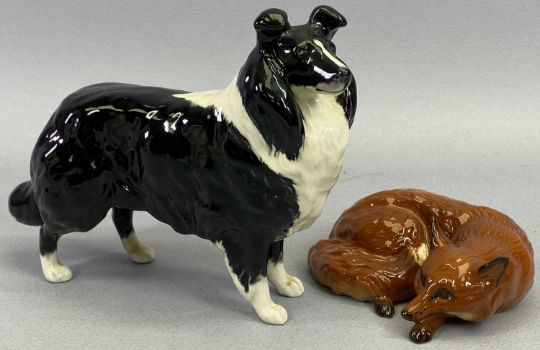 BESWICK FIGURE OF A CURLED UP FOX with Beswick label, Beswick figure of a Collie with label, pair of Beswick figures of seated spaniels with moulded fur and gilt highlights, impressed marks 'Model 1378-4', 24cms H