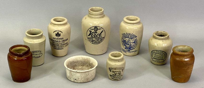 19TH CENTURY EARTHENWARE POTS - a collection for cream and other foods, transfer labels, 14cms H the largest