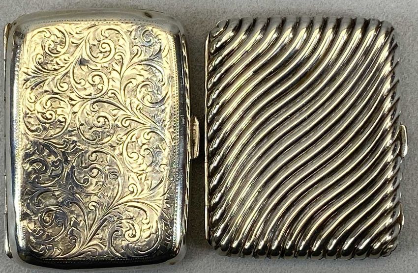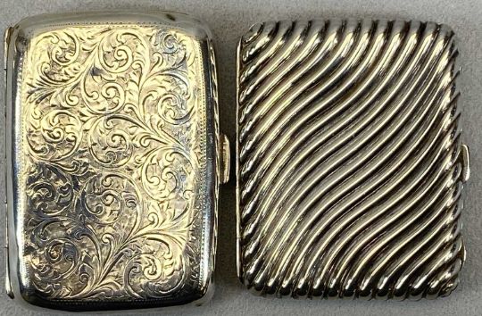 HALLMARKED SILVER CIGARETTE CASE - Chester 1900, Maker William Neale & Sons, the cover engraved with scrolls and monogrammed cartouche, 9 x 6.5cms, 2ozt and a white metal cigarette case embossed with diagonal gadrooning, 8 x 7cms, 2.1ozt