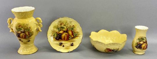 AYNSLEY 'ORCHARD GOLD' LIMITED EDITION MILLENNIUM DAFFODIL VASE 1999 - 2000 - hand painted with fruit and with moulded dragon side handles, 26cms H, an Aynsley 'Orchard Gold' shaped circular bowl painted with fruit, 23.5cms H, a similar plate, 21cms diameter, a similar vase, 15.5cms H, a Majolica teapot of squat circular form and with pewter hinged cover, 15cms H and a Majolica sunflower mug, 9cms H