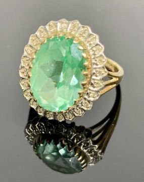 BROOKS & BENTLEY 9CT GOLD DRESS RING - having a central 15 x 10mm facet cut oval, possibly topaz, surrounded by 24 small diamonds in a basket type open back mount, Size Mid P-Q, 5.3grms, in original box