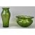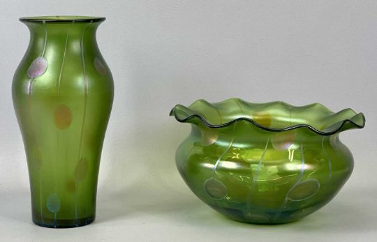 LOETZ STYLE GLASSWARE - slender green glass vase with iridescent stripes and roundels, 25cms H, and a similar, circular jardiniere with wavy rim, 13.5cms H, 25cms diameter