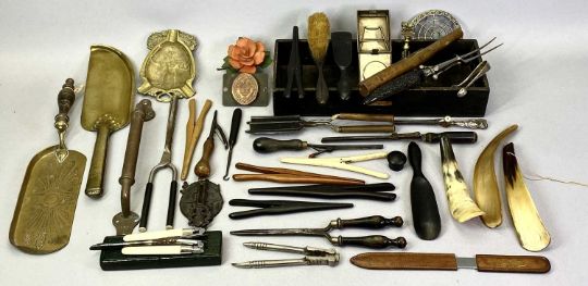 AN OXIDISED COPPER OIL LAMP with pierced brass holder with scrolled wrought iron wall brackets, brass bed warmer and various glove stretchers, curling tongs and other vintage collectables