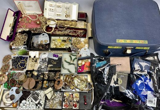 GOLD TONE, JADE TYPE & OTHER COSTUME JEWELLERY - a large mixed quantity with a vintage vanity case and a quantity of jewellery boxes and pouches ETC