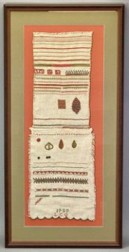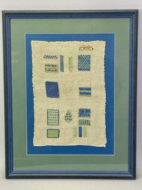 RECTANGULAR COTTON SEWING SAMPLE PIECES (3) - embroidered with a variety of stitches, contained in three glazed frames, 31 x 21cms the largest