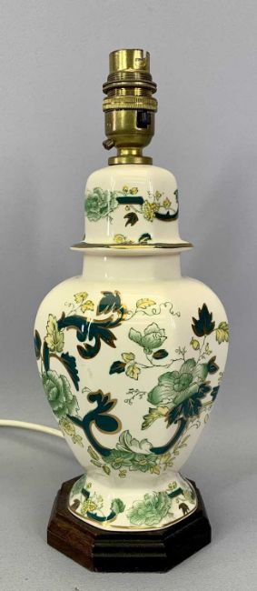 MASONS CHARTREUSE - two graduated jugs, 14cms the tallest, mantel clock, 13cms, table lamp, 26cms excluding fitting, square bowl, 13.5cms and a miniature, circular dish, 8cms