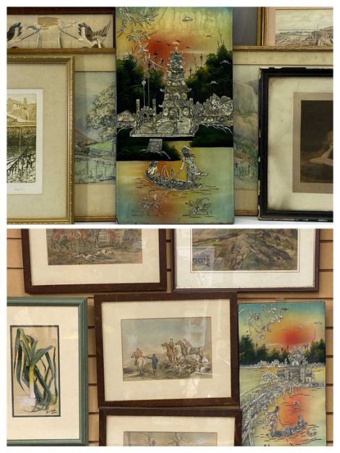 PAINTINGS, PRINTS & OTHER ART WORKS - a mixed collection, ALFRED BURGESS SHORROCKS watercolour - Snowdon, signed, 25 x 36cms, D FLANDERS watercolours (2) - mountain scenes with cottages, one signed, 32 x 46.5cms and 28.5 x 45.5cms, three antique coloured tinted prints of hunting scenes, 21.5 x 32cms, Japanese art works (3) including a silk embroidery depicting butterflies and birds, 51 x 32.5cms and two laquerwork wall panels with mother of pearl inlay, 59.5 x 30cms, six further vintage and later pictures and prints - artists include LIZ TAYLOR, AUDREY HIND, BRIAN TAYLOR and J J HENNER, various subjects and measurements