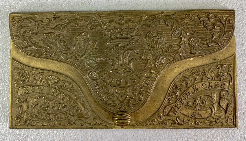 VICTORIAN EMBOSSED BRASS ENVELOPE FORM NEEDLE CASE - 'Louise' by W M Hall & Co, 4.5 x 9cms
