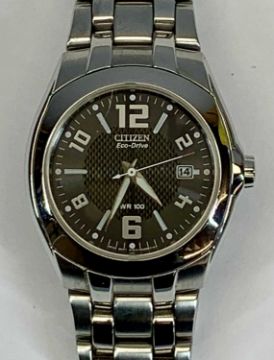 CITIZEN ECODRIVE WR100 WRISTWATCH - 38mm stainless steel case, black dial with Arabic and baton hour markers and date aperture, on Citizen stainless steel bracelet with Citizen silver plastic box and outer box with spare links, guarantee dated 2006 and instruction manual